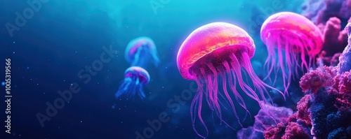 Naklejka premium Bioluminescent deep sea creatures of many shapes and sizes, lighting up the deep ocean in a dazzling display of biodiversity