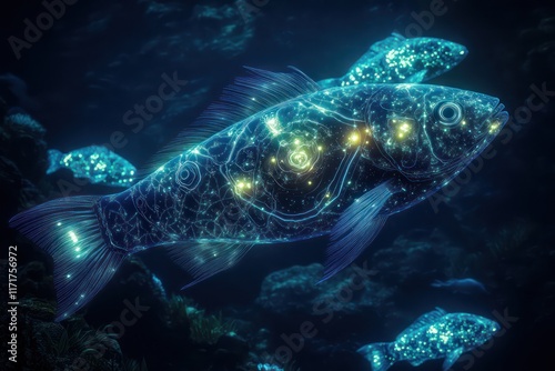 Fototapeta premium Bioluminescent fish with intricate patterns resembling celestial constellations, their bodies glowing softly in deep ocean trenches.