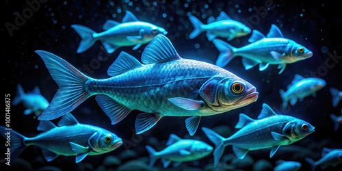 Fototapeta premium Bioluminescent Glow in the Dark Fish Swimming in Mysterious Underwater Environment at Night