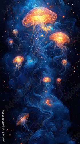 Naklejka premium Bioluminescent jellyfish dance underwater galaxy digital ethereal wide view