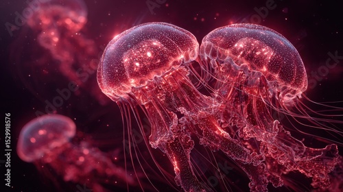 Fototapeta premium Bioluminescent jellyfish float gracefully through the dark waters, their...