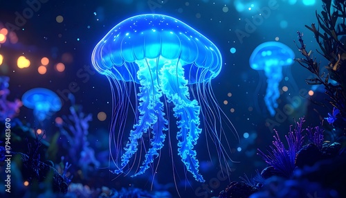 © Yeni, Naklejka premium Bioluminescent jellyfish float in the deep, dark ocean amidst colorful coral and plants, with bokeh lighting effects