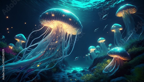 Naklejka premium Bioluminescent Jellyfish Garden: Underwater Fantasy