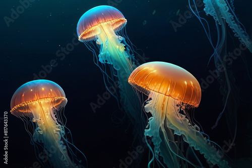Naklejka premium Bioluminescent jellyfish illuminate the abyss, creating an ethereal and...