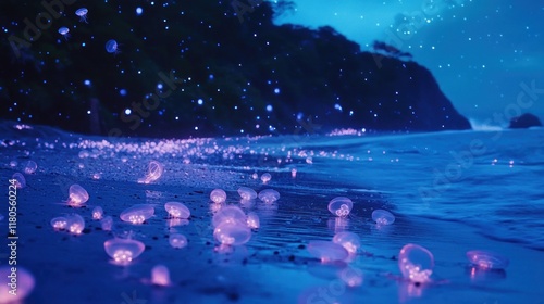 © hazia, Obraz premium Bioluminescent jellyfish wash ashore at night on a dark beach.