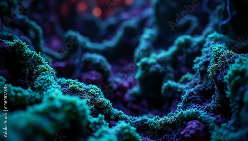 © Дмитрий Рожков, Obraz premium Bioluminescent moss intertwines with circuits in a dark lab, glowing teal against obsidian rock.