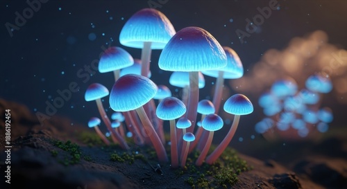 Fototapeta premium Bioluminescent mushrooms glowing with ethereal blue light in a dark, mystical...