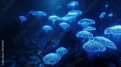 Fototapeta premium Bioluminescent organisms in a mysterious ocean scene background