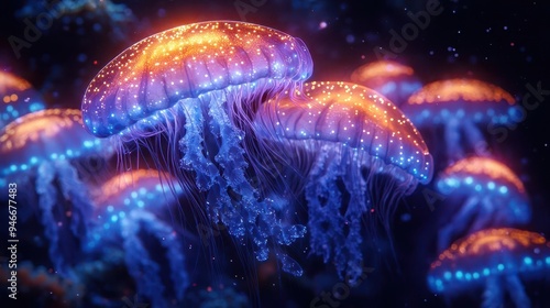 © julija, Fototapeta premium bioluminescent underwater scene ethereal jellyfish shimmering particles deep sea mystery