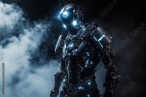 © Vesna, Fototapeta premium biomechanical exoskeleton suit with glowing energy cores sleek chrome and matte black finish atmospheric fog and dramatic lighting