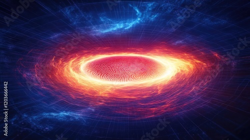 Fototapeta premium Biometric fingerprint glowing in a holographic grid with a deep blue background.