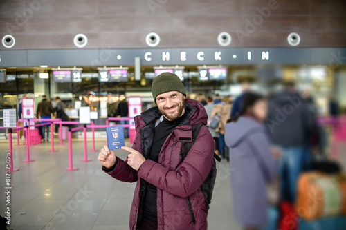 Fototapeta premium Biometric passport of Ukraine. A man at the airport in Gdansk, Poland.