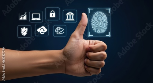 Fototapeta premium Biometric Security Approval: Thumb Up for Fingerprint Recognition, Data Protection and Secure Authentication Technology
