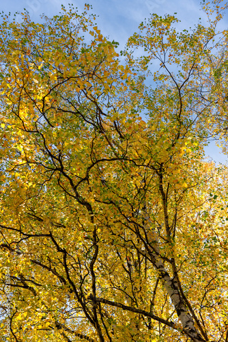 © YuNIK, Fototapeta premium Birch autumn foliage in the blue sky.