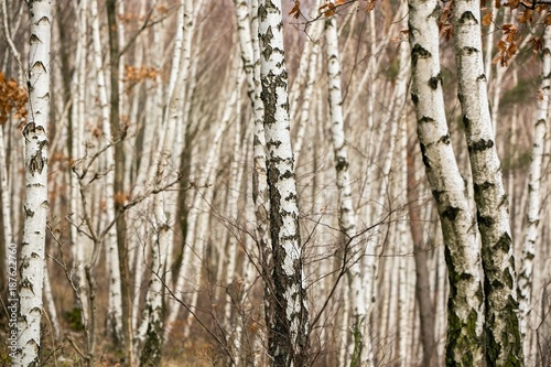 Fototapeta premium Birch autumn forest. Betula pendula (Silver Birch). Dense forest. White birch trees in row. Country Slovakia, Europe.