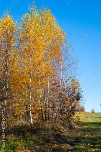 Fototapeta premium Birch copse in the autumn. Early morning light. Świętokrzyskie, Poland.