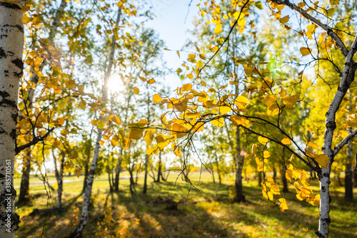 Obraz premium Birch forest in the sunny autumn evening. Autumn Landscape. Selective focus.