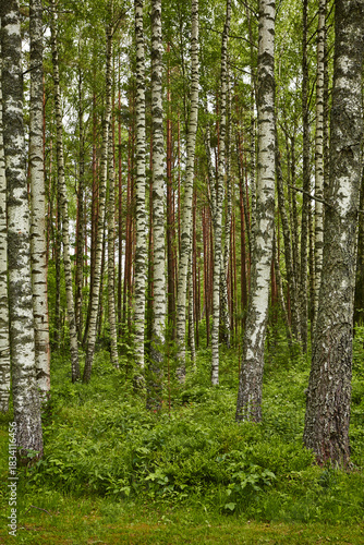 © EdienuFoto, Fototapeta premium Birch forest showing tall white trunks and vibrant greenery