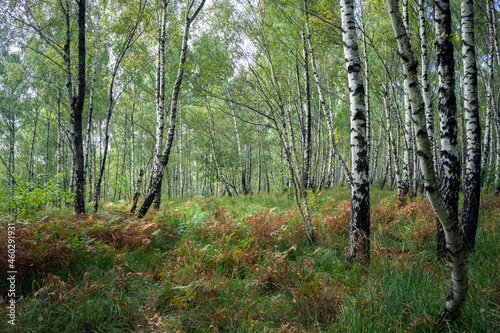 © baxys, Fototapeta premium Birch forest with grass and ferns.