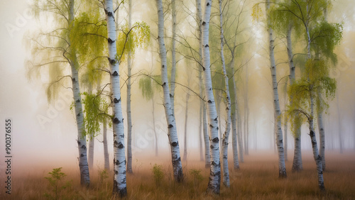 © Janis Smits, Fototapeta premium Birch grove in mist.