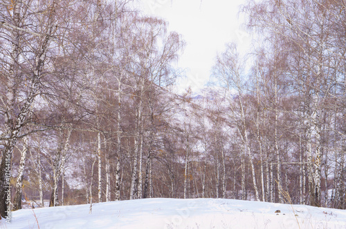 Fototapeta premium Birch grove in the mountains in winter. no leaves on birches.