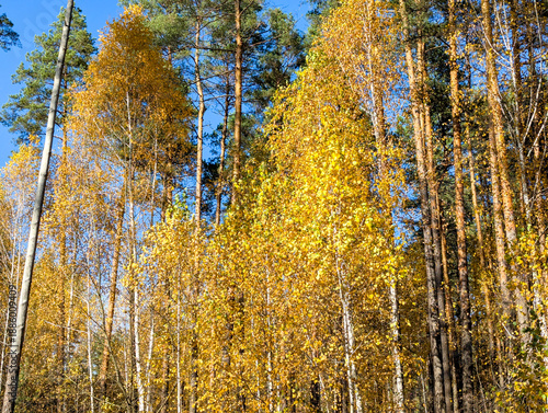 Fototapeta premium Birch grove on sunny autumn day, beautiful landscape through foliage and tree...