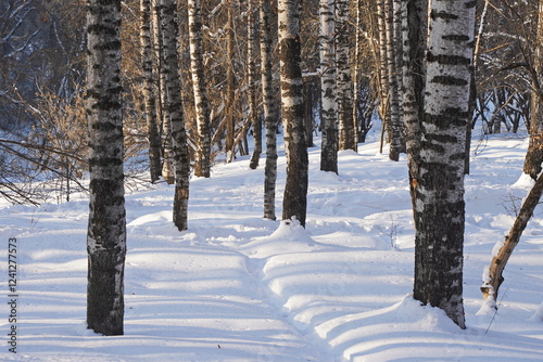 Fototapeta premium Birch grove. Tree trunks in winter.