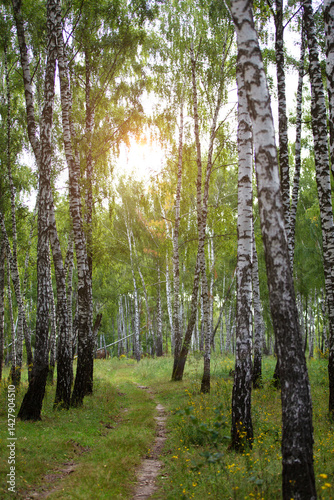 © Светлана Лазаренко, Fototapeta premium Birch grove with a path overgrown with green grass in the rays of the setting sun.