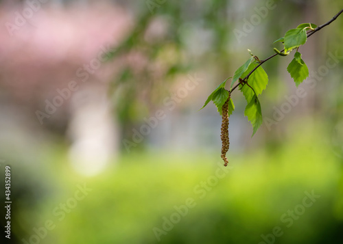© Iryna, Naklejka premium birch leaves against houses on a spring day