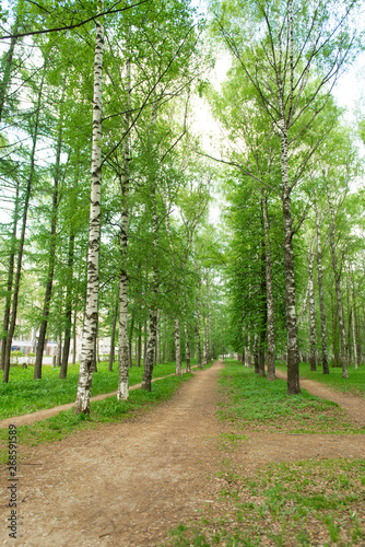 Obraz premium Birch Park with walkways for pedestrians on a summer day.