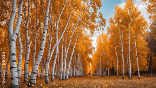 © Riddhi, Obraz premium Birch Tree Forest In Autumn With Golden Leaves And A Light Blue Sky