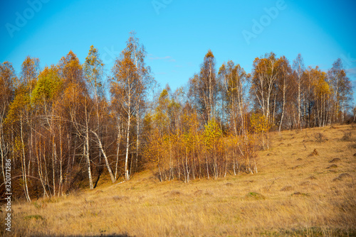 © Ivanica, Fototapeta premium Birch tree landscape in the morning autumn