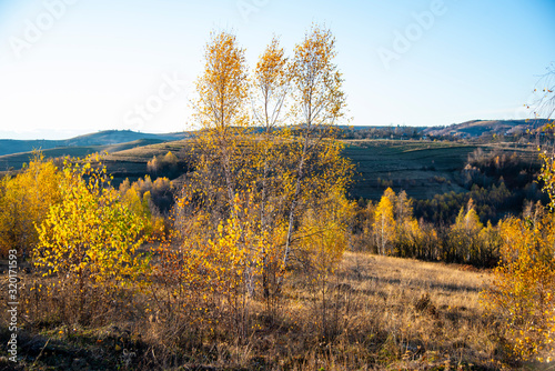 Fototapeta premium Birch tree landscape in the morning autumn