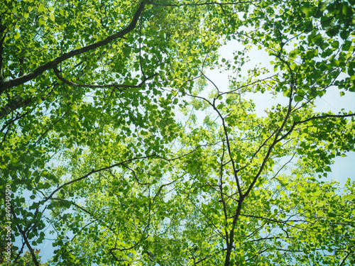 © Alex, Fototapeta premium Birch tree spring leaves on sunlight background