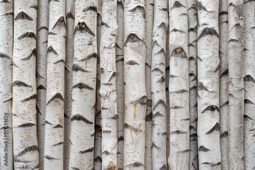 Fototapeta premium Birch tree trunks with distinctive white bark and dark markings, arranged...