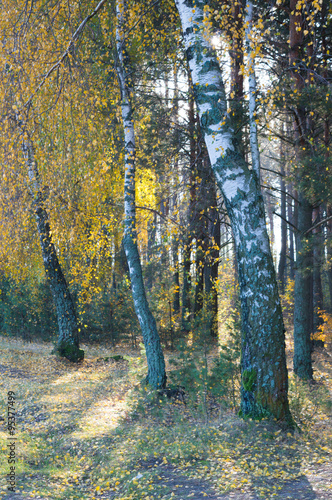 Fototapeta premium birch tree with green yellow leaves fall