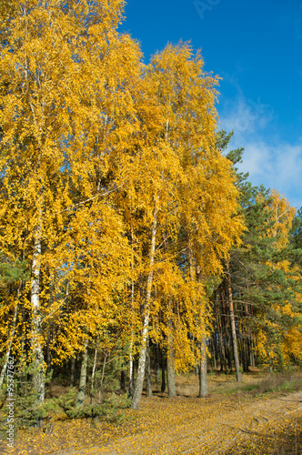 Fototapeta premium birch tree with green yellow leaves fall