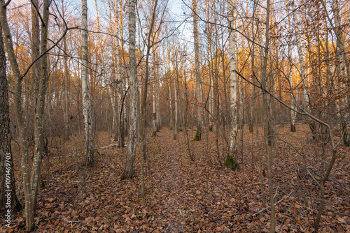 Obraz premium birch trunks and fallen leaves in the autumn forest in the evening