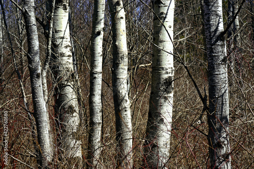 © Chet Wiker, Fototapeta premium birch trunks display their white bark. Nathaniel Cole Park in Harpursville in Broome County in Upstate NY. A stand of white birch trees in early spring. Brown woods before green of spring arrives.