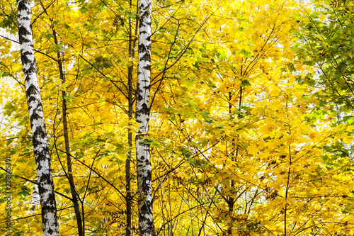 Fototapeta premium birches in yellow leaves of maple tree in forest