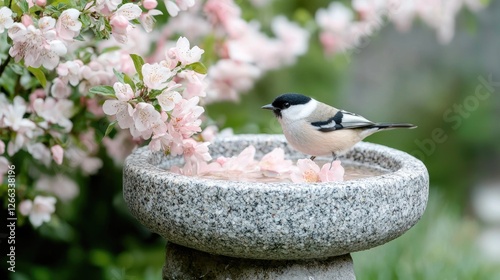 © tugkiara, Obraz premium Bird at a birdbath in a blossoming garden