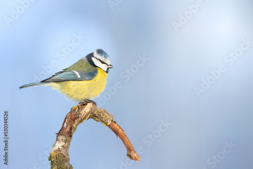 © Marcin Perkowski, Naklejka premium Bird - Blue Tit ( Cyanistes caeruleus ) perched on tree winter time small bird on blue background