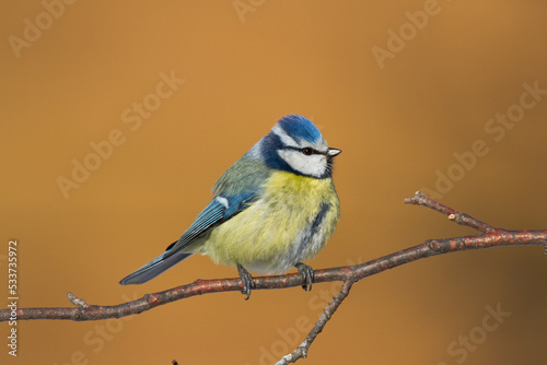 Fototapeta premium Bird - Blue Tit ( Cyanistes caeruleus ) perched on tree winter time small bird on blurred background