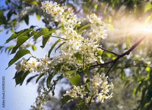 Fototapeta premium Bird cherry branches with white flowers