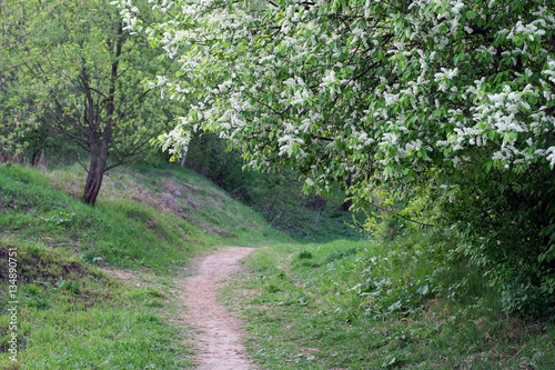 Obraz premium Bird-cherry tree in bloom and a curved rural path