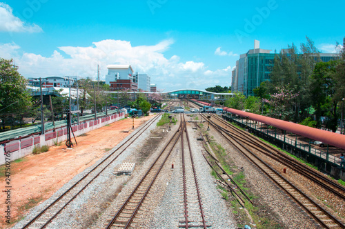 © Chanchai, Naklejka premium Bird eye Interception Railway with blue sky