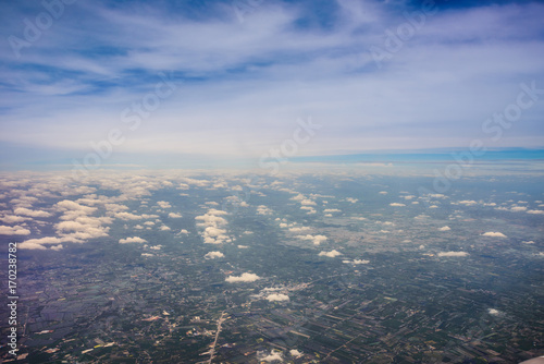 © bigy9950, Fototapeta premium Bird eye view of residential landed early in Thailand. Aerial view from the window of an airplane