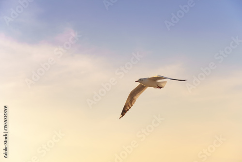 © Phanthep, Obraz premium Bird flying at sunset