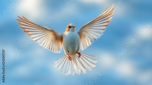 © Nawarit, Obraz premium Bird flying in sky, close-up of wings in motion, soft clouds in the background