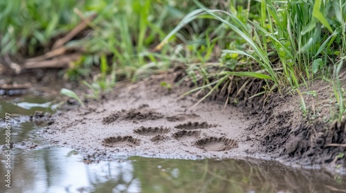 © Pannee, Obraz premium Bird footprint marks on muddy pond shore showing brief interaction with habitat